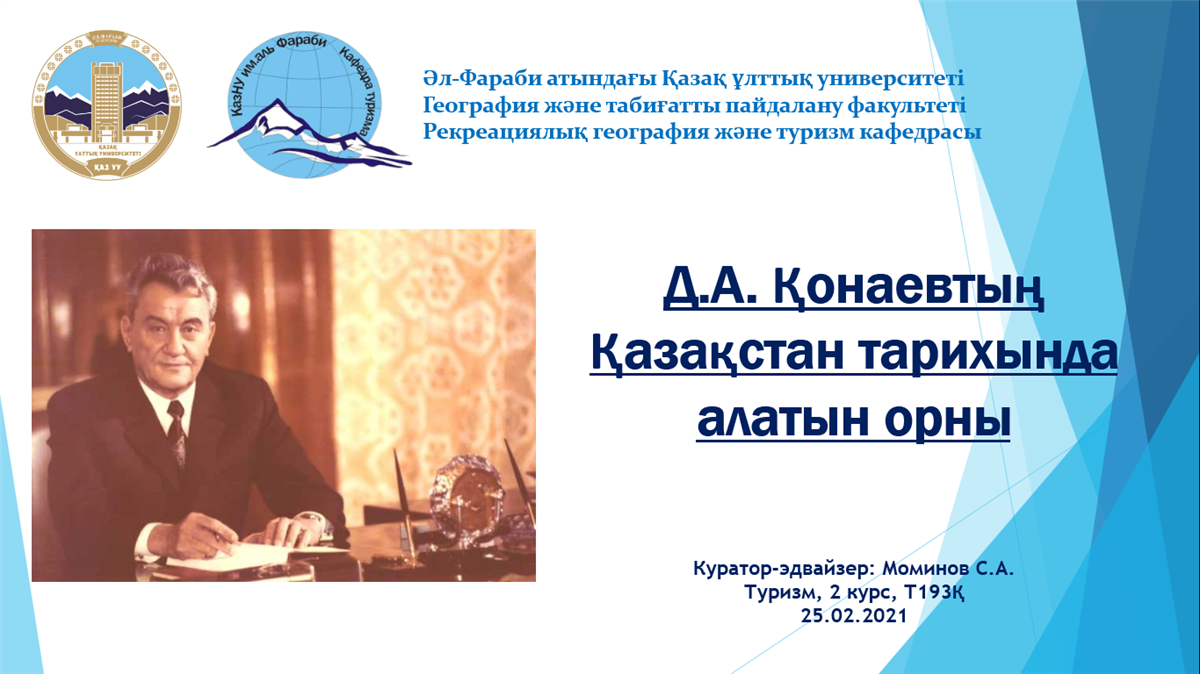 2/25/2021On February 25, 2021, in the curatorial group of the teacher S.A. Mominov of the Department of Recreational Geography and Tourism, an open curatorial hour was held on the topic “The role of D.A. Kunayev in the history of Kazakhstan ”. Students thoroughly prepared and approached this event responsibly. They prepared a presentation on D.A. Kunayev and a small blitz survey. As we all know, the role of Dinmukhamed Kunayev in the modern history of Kazakhstan is very difficult to overestimate. During the years of his leadership, Kazakhstan reached very great heights in all spheres of life - from industry and agriculture to culture and sports. During the curatorial hour, students presented very interesting facts from the life of Dinmukhamed Kunayev. The event took place in a friendly and warm atmosphere.
