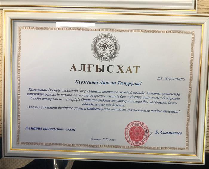 Dinali Timurovich, a student of the Department of Recreational Geography and Tourism, was awarded on behalf of the Almaty city administration for his contribution and work to ensure the quarantine regime in Almaty during the declared state of emergency in the Republic of Kazakhstan.