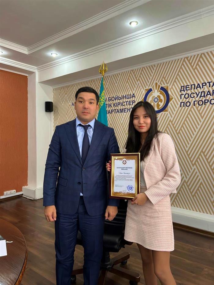 Undergraduates of the Department of Customs, Financial and Environmental Law took part in the organization and holding of the international forum "Silk Road", organized by the Department of State Revenue in Almaty. For high-quality work in the organizing committee, Undergraduates Begalieva Janel and Tolegen Ayazhan were awarded a Letter of Thanks from the head of the State Revenue Department in Almaty.DKD in Almaty is a reliable partner of the department in the field of training personnel for customs authorities, organizing the practice of students and undergraduates as a base of practice, conducting joint scientific and career guidance events.