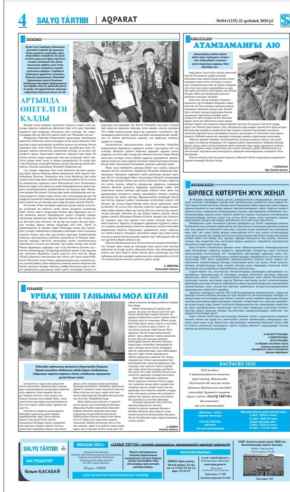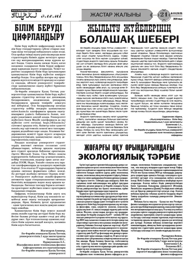 | 7 | Виртуалды физикалық эксперимент- жахандаудағы бір қадам | Түркі әлемі газеті | Түркі әлемі газеті № 9-10 (қыркүейк-қазан, 218-219) 2020. – 17 б. |
