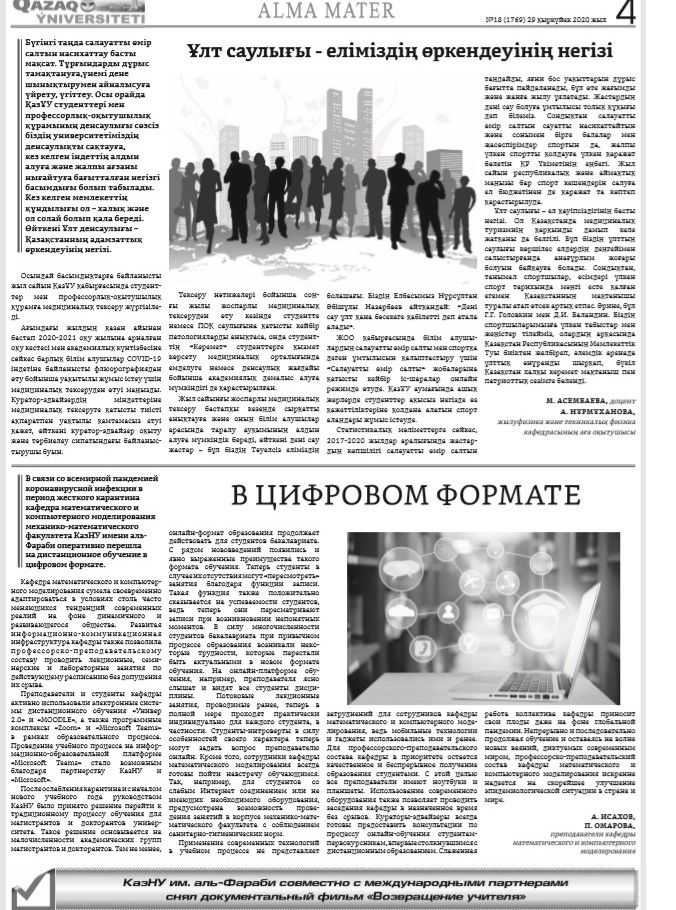 | 4 | Б.Бектібай, Г.Жуман | Қашықтан окқыту мүмкіншіліктері | Қазақ университеті газеті |