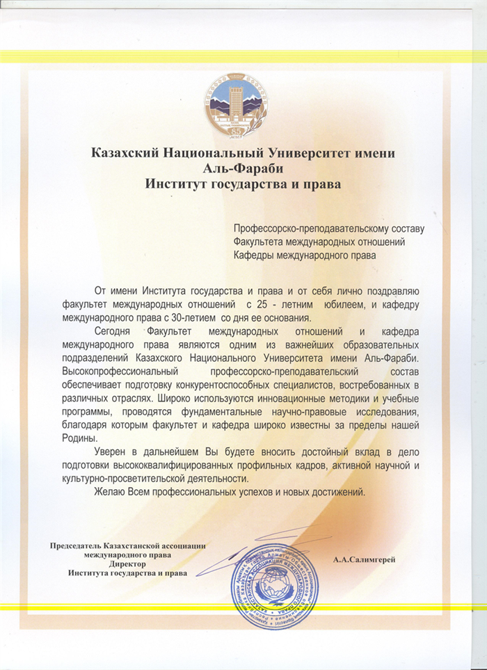 Congratulations of the Institute of state and law named after al-Farabi