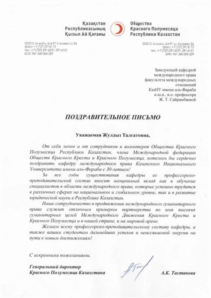 Congratulations from the Red Crescent Society of the Republic of Kazakhstan
