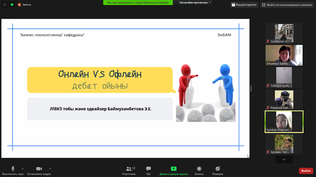 12/9/20209.12.2020 13.00 Debate on the topic "Online VS Offline" was organized by students of the 3rd year of the group Log18k5 specialty "Logistics" Department of Business Technology of the Kazakh National University named after al-Farabi, Curator-Advisor Baimukhanbetova E.E.