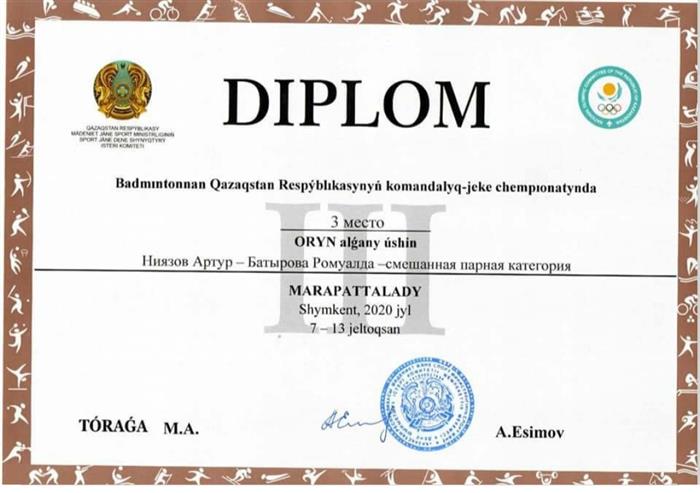 From December 7 to 13, 2020, the team-personal Badminton Championship of the Republic of Kazakhstan ended in Shymkent. The best athletes from the city of Almaty, the city of Shymkent, Turkestan, Karaganda, Akmola, Kostanay and West Kazakhstan regions of the Republic of Kazakhstan took part in this sporting event. According to the results of the Championship, 2nd year doctoral student in the specialty "Physical culture and sports", master of sports of international class of the Republic of Kazakhstan in badminton, Artur Niyazov became the champion in both the men's singles category and the men's doubles category, as well as a bronze medalist in the mixed doubles category.