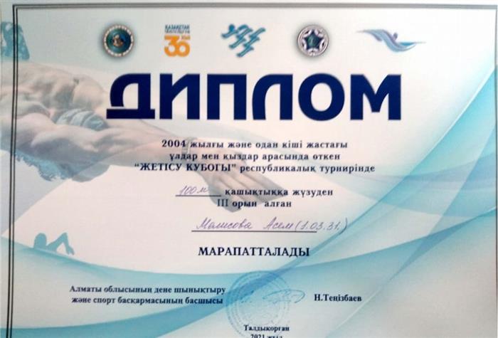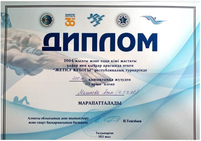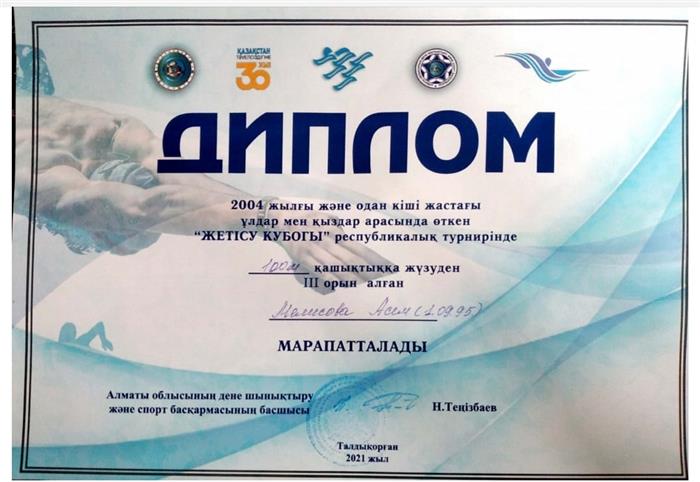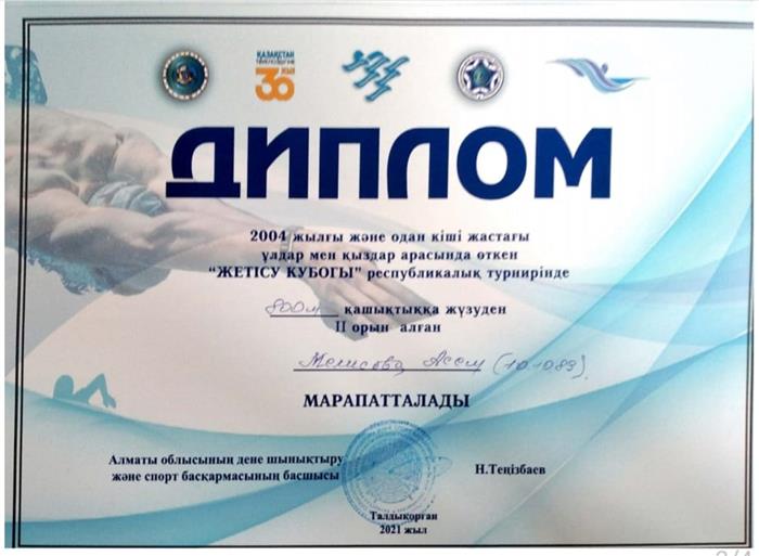 From December 20 to December 22, 2021 in Taldykorgan (RK) the Republican tournament "Zhetysu Cup" among boys and girls 2004 in swimming was held, where a 1st year student of the Faculty of Medicine and Health with a degree in Physical Culture and Sports Melisova Asem took 2nd place in the 800m freestyle with a score of 10.10.89, 3rd place in the 100m freestyle with a score of 1.03.31, 3rd place in the 400m freestyle with a score of 4.57.68