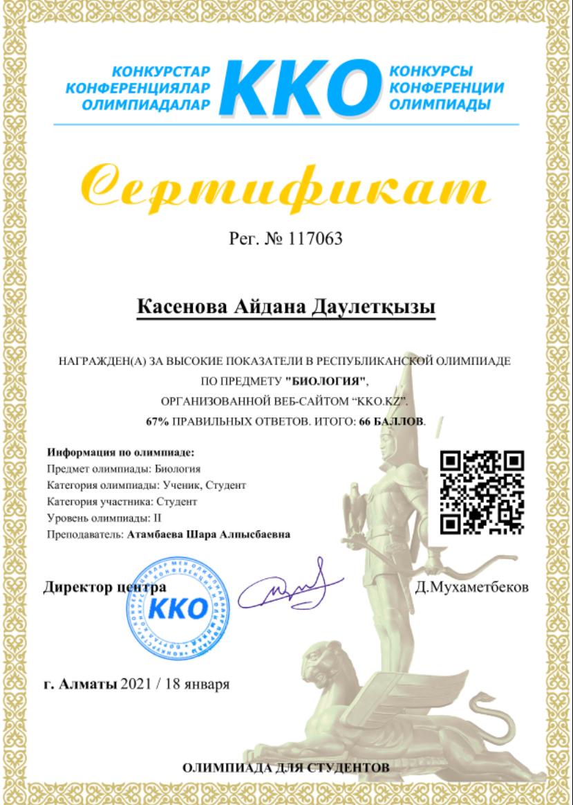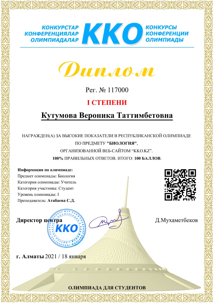Kutumova Veronica Tattimbeta. Diploma of the 1st degree Republican Olympiad on the subject of Biology, organized by the website "KKO.KZ" 1/18/2021 Read more >>