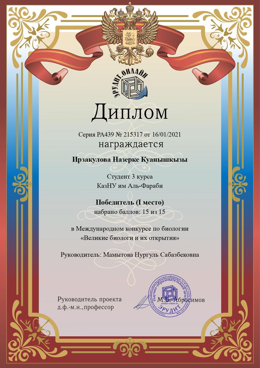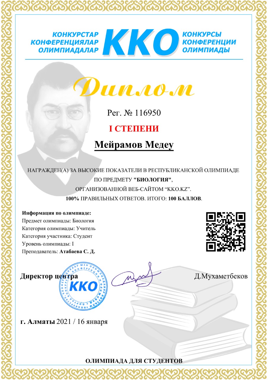 Meiramov Medeu. Diploma of the 1st degree Republican Olympiad on the subject of Biology, organized by the website "KKO.KZ" 1/16/2021 Read more >>