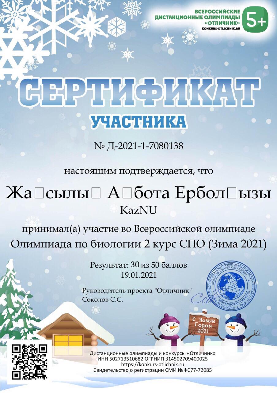 3ar student of the specialty «Biotechnology» Zhaқsylyk Akbota Erbolқyzy took part in the All-Russian Olympiad for students" Olympiad in biology of secondary vocational education (Winter 2021) 19.01.2021 and was awarded a Participant Certificate (result 30 out of 50 points). 1/19/2021 Read more >>
