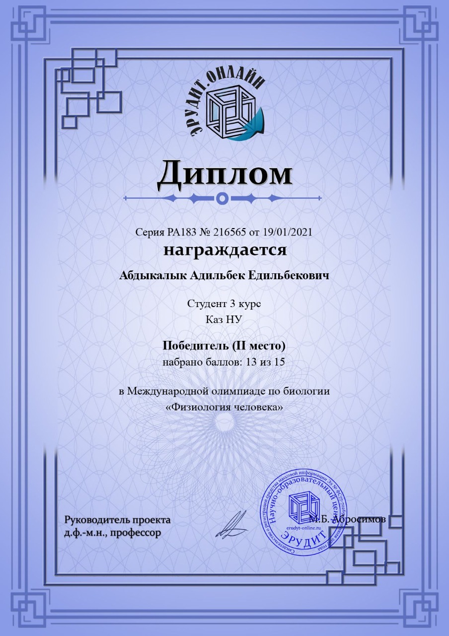 3rd year student of the specialty "Biotechnology" Abdygalyk Adilbek Edilbekovich was awarded a Diploma (2st place) in the international competition in biology "Human physiology " 1/19/2021 Read more >>
