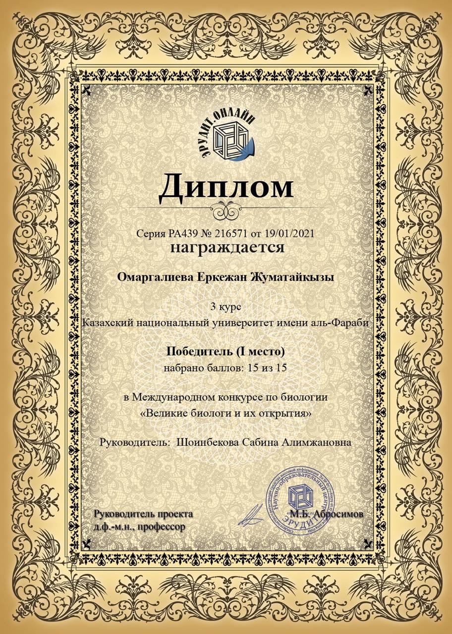 3-year student of the specialty "Biotechnology" Omargalieva Erkezhan Zhumataigyzy was awarded a Diploma (1st place) in the international competition in biology "Great biologists and their discoveries" 1/19/2021 Read more >>