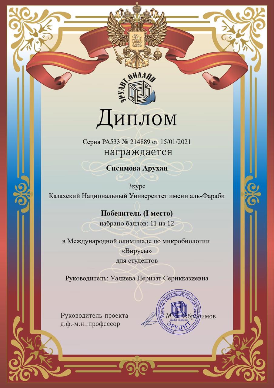 Sisimova Arukhan, 3-year student of the specialty "Biotechnology" was awarded a Diploma (1st place) at the International Olympiad in Microbiology "Viruses" 1/15/2021 Read more >>