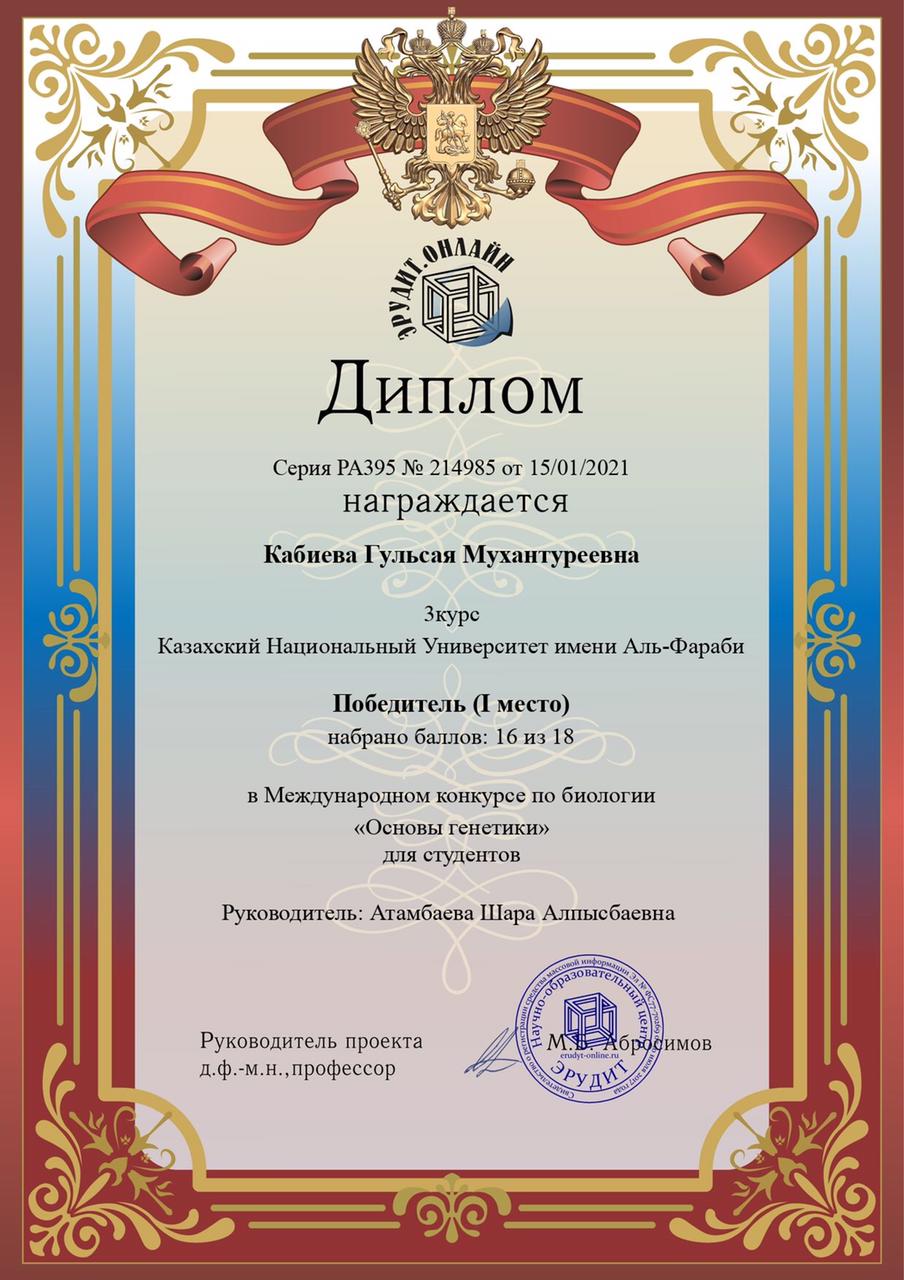 3-year student of the specialty "Biotechnology" Kabieva Gulsaya was awarded a Diploma (1st place) in the international competition in biology " Fundamentals of Genetics for Students". Curator-adviser Atambayeva Sh.А. 1/15/2021 Read more >>