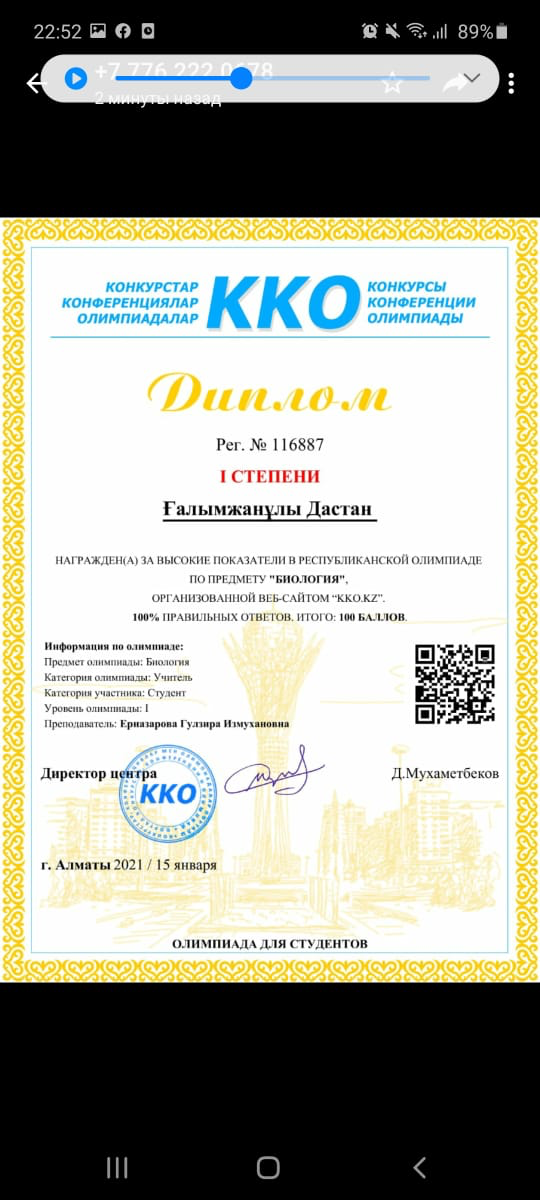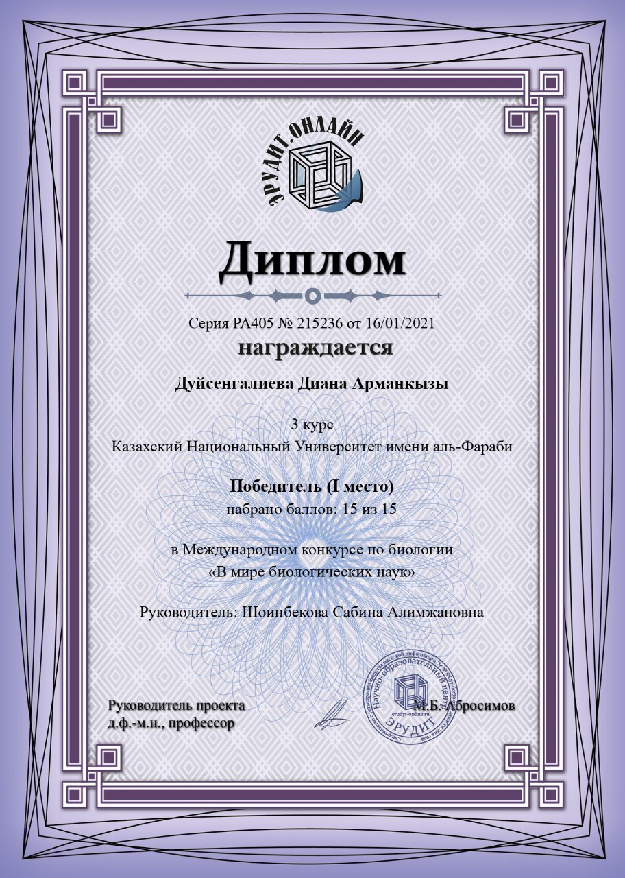 Dastan Galymzhanuly, a student of the specialty "Biotechnology" was awarded a Diploma (1st place) in the Republican Olympiad on "Biology" organized by the website www.kko.kz 1/15/2021 Read more >>