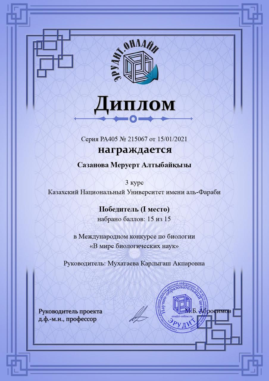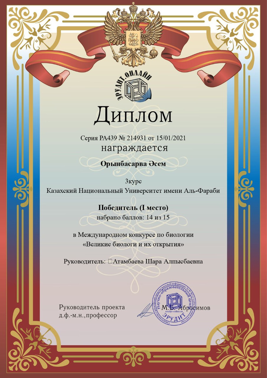 Sairanbekova Nazym, 4-year student of the specialty "Biotechnology" was awarded a Diploma (1st place, № ФС 77 — 74651) at the All-Russian Olympiad in "General Microbiology» - scientific advisor Kaiyrmanova G.K. 1/15/2021 Сайранбекова Назым certificate_online.pdf Read more >>