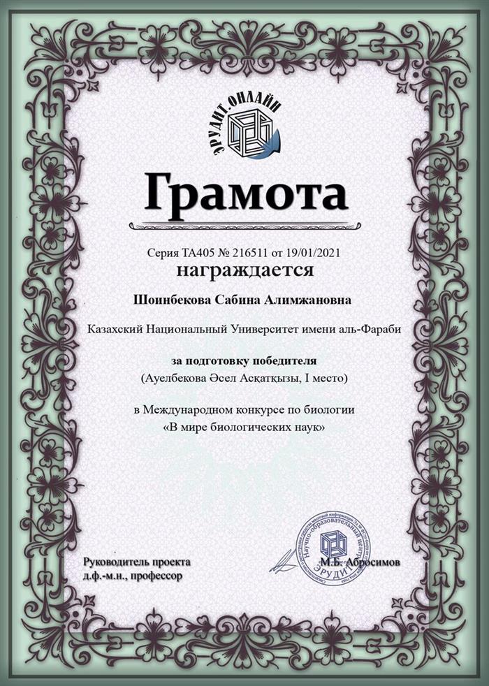 3rd year student of the specialty "Biotechnology" Auelbekova Asel Asgaatkyzy was awarded a Diploma (1st place) in the international competition in biology "In the world of biological sciences"