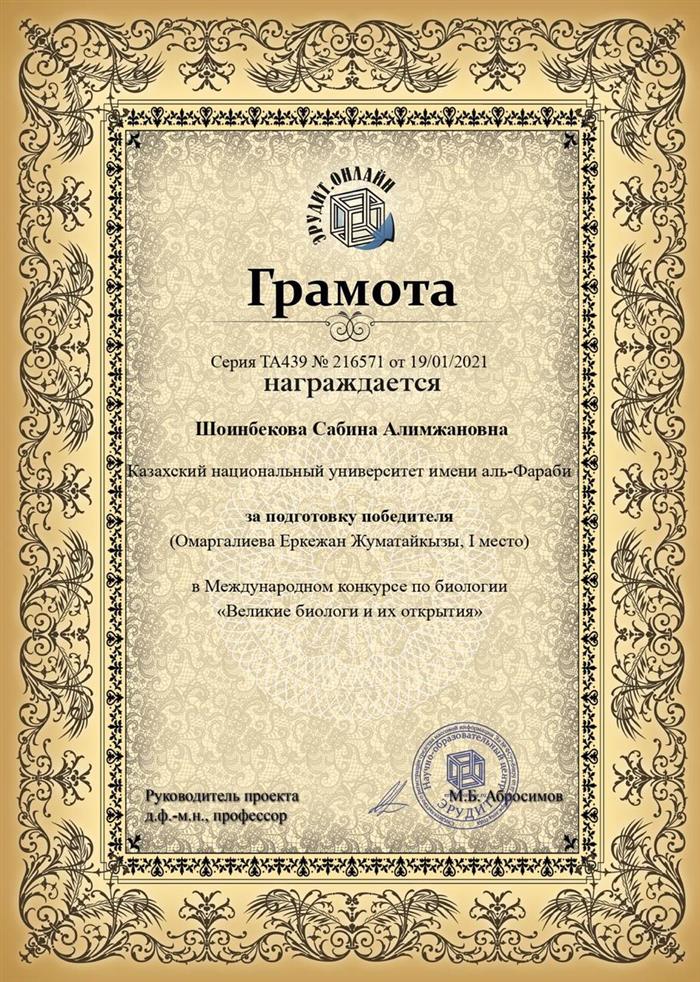 3-year student of the specialty "Biotechnology" Omargalieva Erkezhan Zhumataigyzy was awarded a Diploma (1st place) in the international competition in biology "Great biologists and their discoveries"