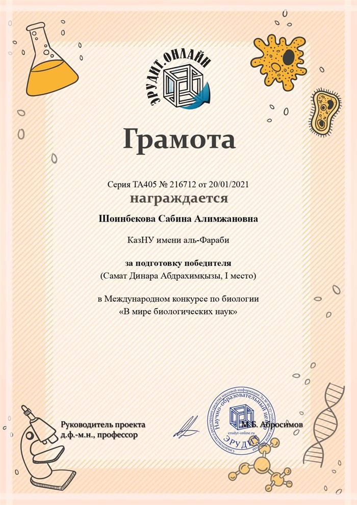 3rd year student of the specialty "Biotechnology" Samat Dinara Abdrakhimkyzy was awarded a Diploma (1st place) in the international competition in biology "In the world of biological sciences"