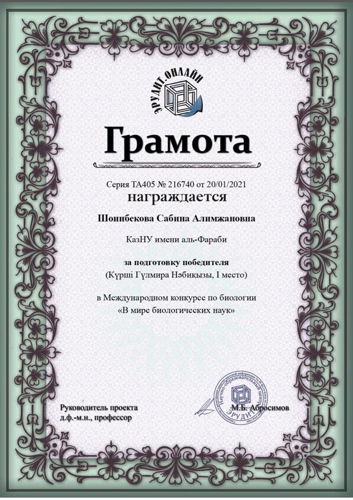3rd year student of the specialty "Biotechnology" Kurshi Gulmira Nabikyzy was awarded a Diploma (1st place) in the international competition in biology "In the world of biological sciences"