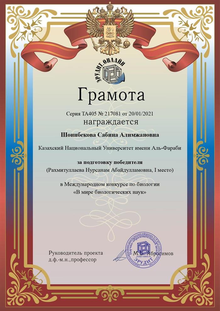 3rd year student of the specialty "Biotechnology" Rakhmatullaeva Nursanam Abaydullamovna was awarded a Diploma (1st place) in the international competition in biology "In the world of biological sciences"