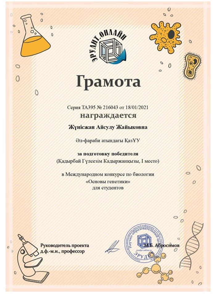 4th year student of the specialty "Biotechnology Kadyrbai Gulsezim Kadyrzhangyzy was awarded a Diploma (1st place) in the International Olympiad in Biology" Fundamentals of Genetics ".