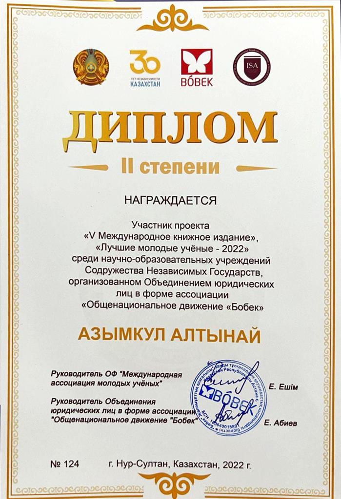 Awarded the breast medal "Best Young Scientist 2022"(Azymkul Altynai – Master's student of the specialty "Pedagogy and Psychology")