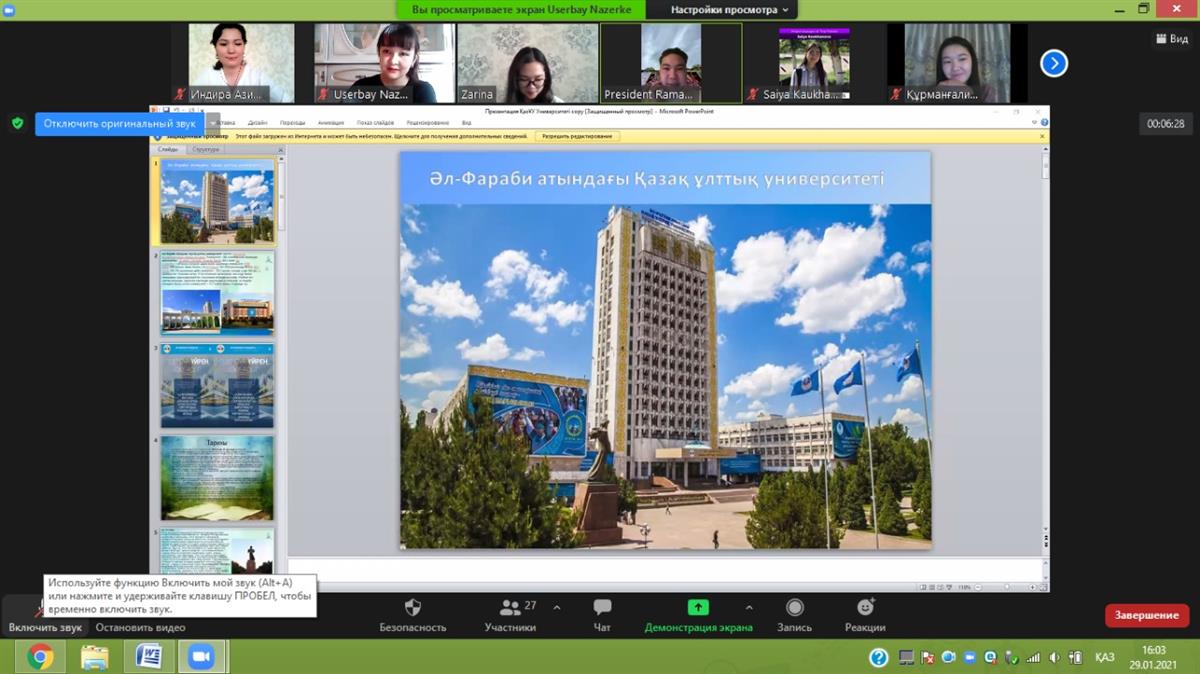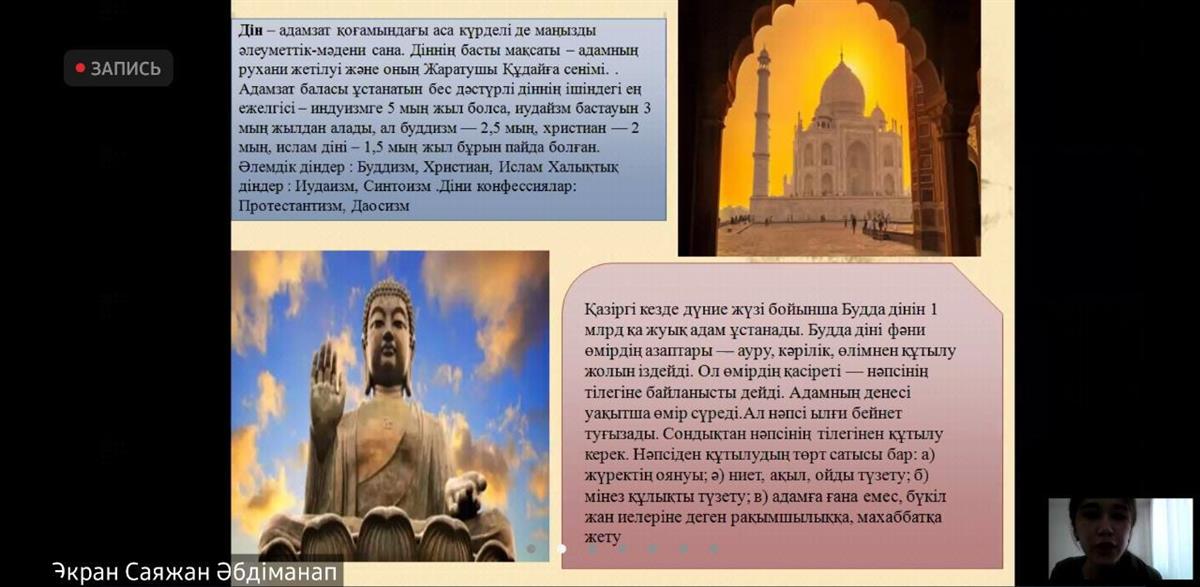 2/17/2021On February 17, 2021, on the basis of the Al-Farabi Kazakh National University at the Faculty of Philology and World Languages on the Zoom platform, was organized an information and educational event as “The Place of Religion in Society” by adviser R.A. Torekhanova within the framework of the project “Ainalady Nurlandyr” among 2nd year students of the specialty "Translation Studies".