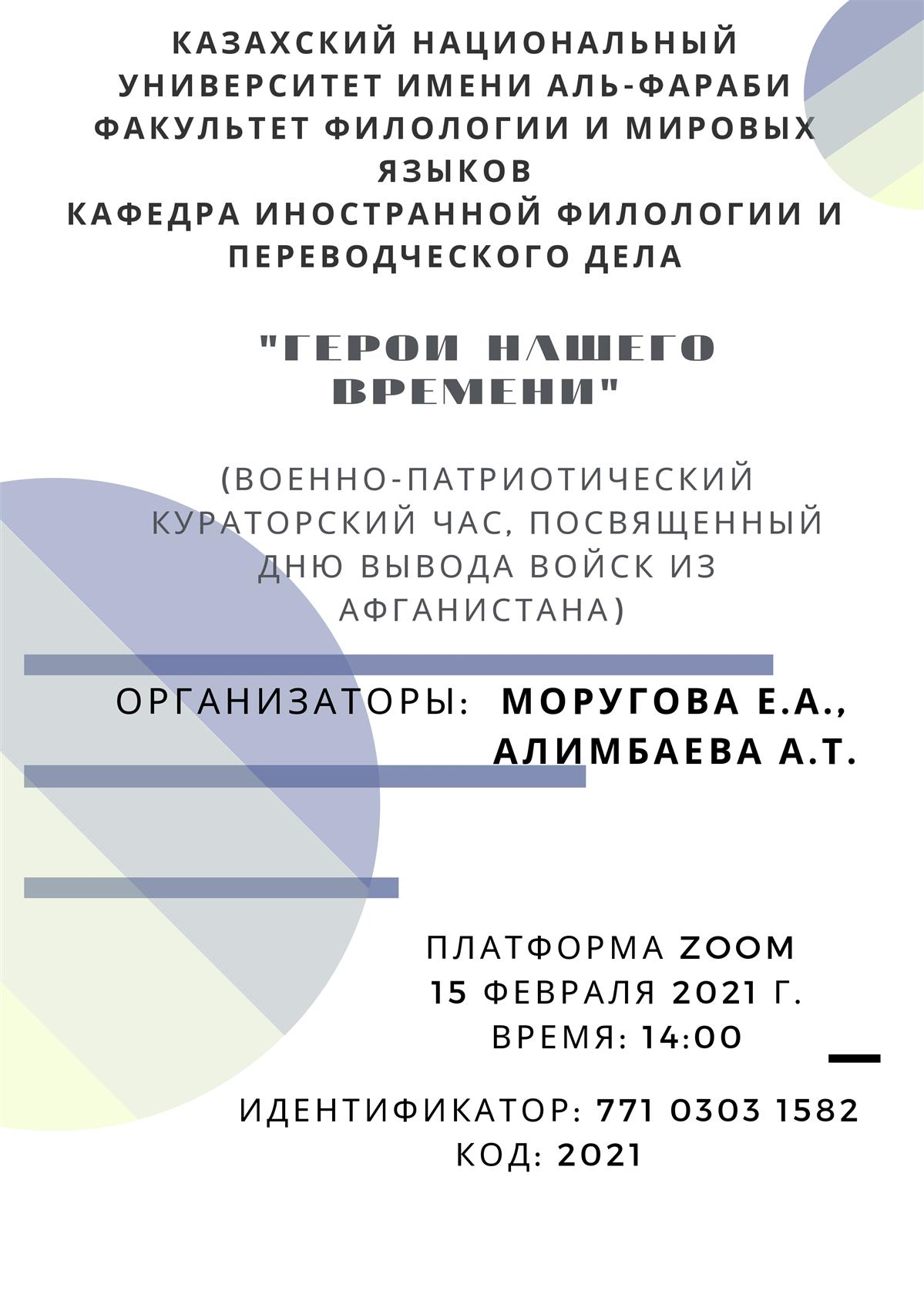 Department of Foreign Philology and Translation Studies of the Faculty of Philology and World Languages and 1-year students of “Foreign Philology” are pleased to invite you to the informative event “Heroes of Our Time” (military-patriotic curatorial hour), which will be held in the framework of the program “Ruhani Zhangyru”.