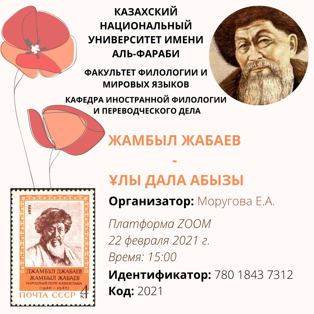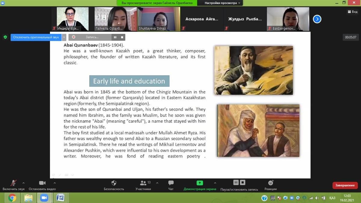 2/19/2021On February 19, 2021 at the Faculty of Philology and World Languages the event called "Knowing Abai is our duty" was organized by teachers Azimbaeva I.K. and Musaly L.Zh. within the framework of the project "Ainalandy nurlandyr" among the 2nd year students in the specialty "Foreign Philology"on the Zoom platform. Students have read poems of the great Abai, moreover, educational videos and presentation were shown. Participants answered test questions and actively took part in the event.