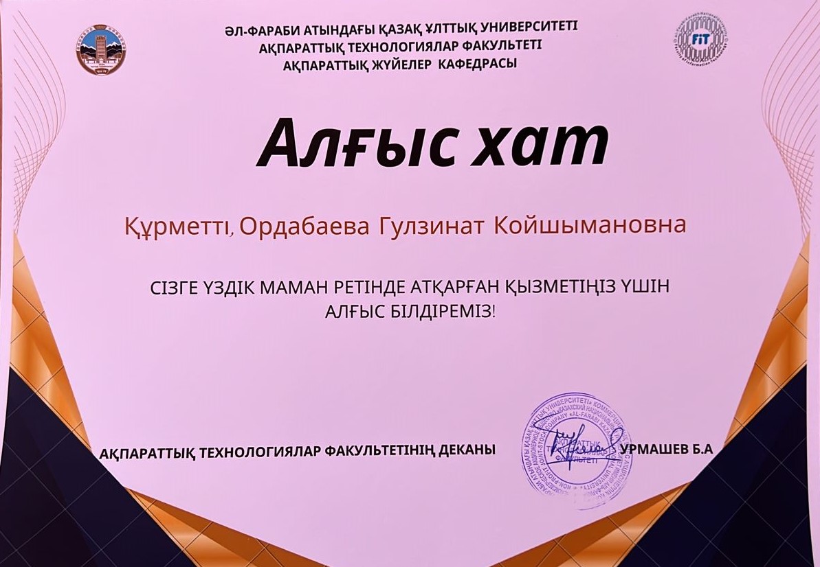 Ordabaeva Gulzinat was awarded a letter of thanks for her work as an excellent specialist of the Faculty of Information Technology.