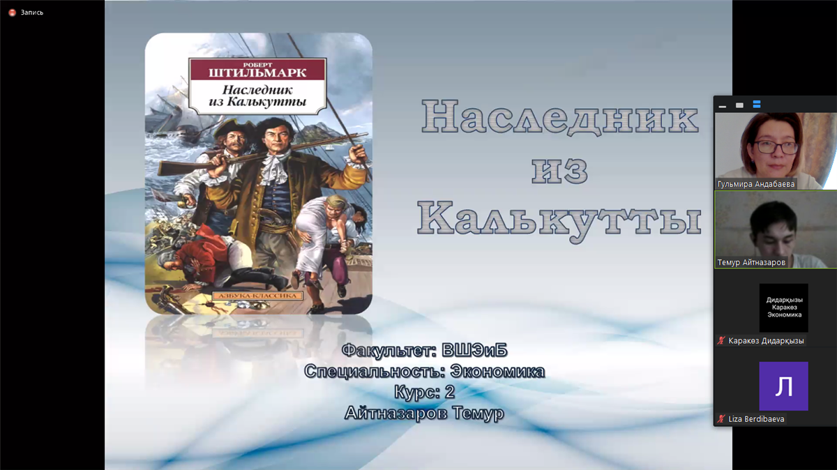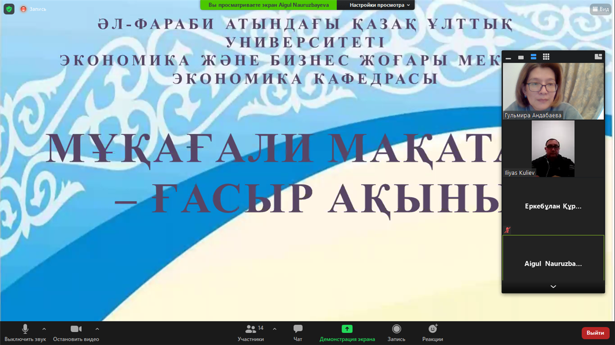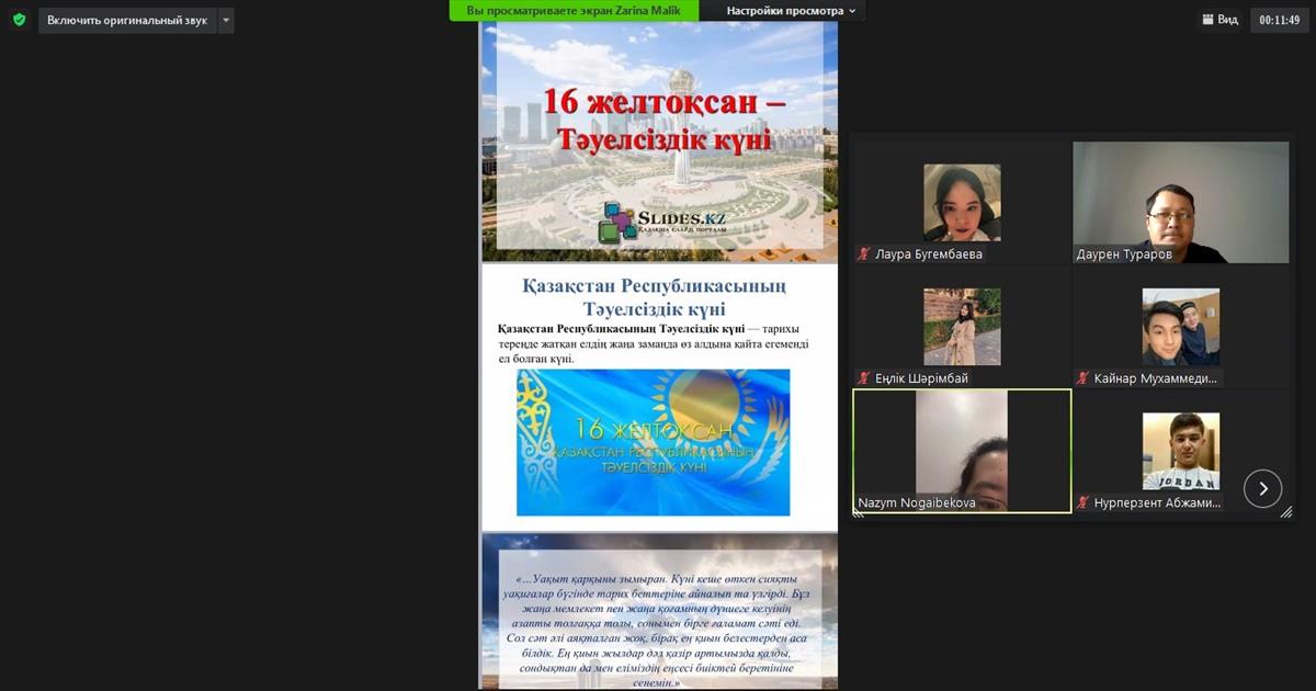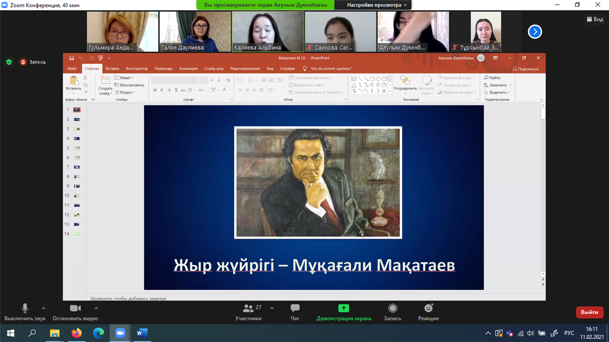 2/11/2021Within the framework of the project "Aynalandy nurlandyr" students of the specialties "Economics" and "Kazakh Philology" with advisers G.R.Dauliyeva and G.K.Andabaeva held a curatorial hour dedicated to the 90th anniversary of Mukagali Makatayev on the theme “Zhyr zhuirygy – Mukagali Makatayev”. The creative heritage of Mukagali is full of lyrics. Mukagali's poetry reflects the nature of all Kazakhs. The duty of our generation is to popularize the works of the poet with their characteristic sound, the mysterious handwriting of the poet, who have found their way to the heart of the entire Kazakh people. First-year students of the specialty "Kazakh Philology" expressively, with a soul read the poet's poems.