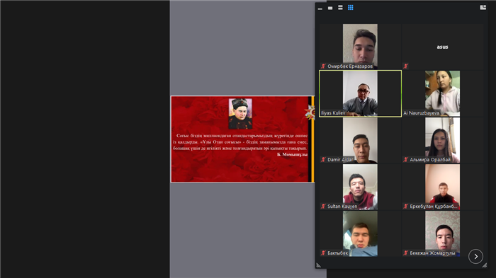 The event dedicated to the work of Baurzhan Momyshuly "Ushkan uya" was organized by 2nd year students of the specialty "Economics" within the framework of the social project of KazNU "100 books". Purpose: to show today's youth an example of respect, heroism and national patriotism, always remember the national hero Baurzhan Momyshuly, who showed heroism in defending the country and land from the enemy in the World War II.