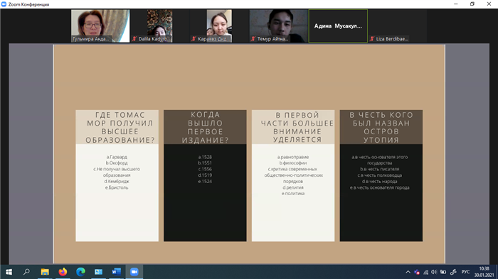 Within the framework of the project "100 books", 2nd year students of the specialty "Economics", with the adviser G.K. Andabaeva held curatorial hour on the topic "Utopia" by Thomas More. Utopia is an ideal society of universal justice that exists only in the imagination. The term comes from the title of the book by the English philosopher of the XVI century Thomas More "Utopia". After this work, the word became a household word - all literary works devoted to the description of an ideal state and society began to be called utopias.