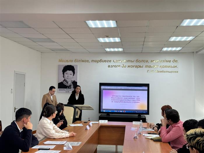 Students Bakytbekova Malika, Doktorovich Alisa, Mutalipova Dilnara made presentations “The role and responsibility of students in preventing domestic violence”, “Responsibility for domestic violence under the legislation of the Republic of Kazakhstan and foreign countries”.