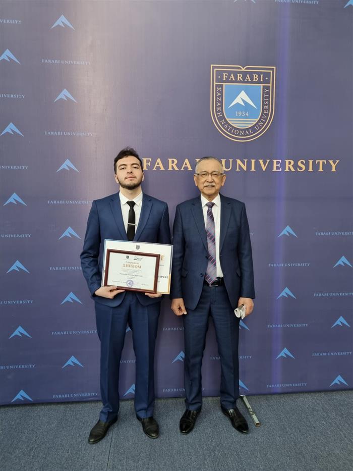 In the Faculty of International Relations, 1st place Diploma and a cash certificate from the Chairman of the Board - Rector of Al-Farabi KazNU Zhanseit Tuimebaev, awarded to 4th year student of the EP “International Law” Raimkulov Zamanbek.