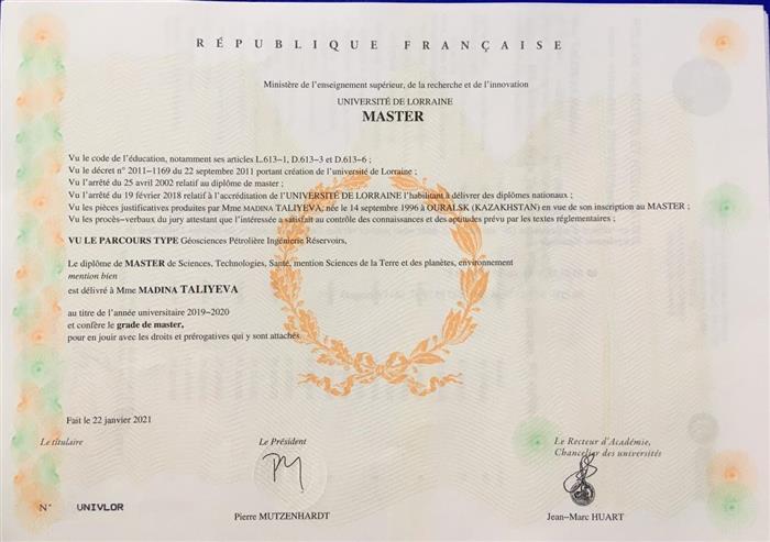Diploma of awarding a master's degree to Taliyeva M.Kh. by University of Lorraine, 2021 |