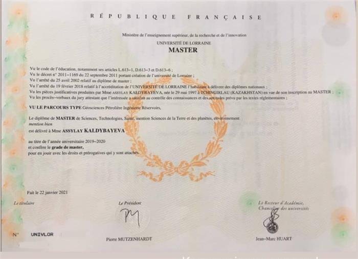 Diploma of awarding a master's degree to Kaldybayeva A.K. by University of Lorraine, 2021 |