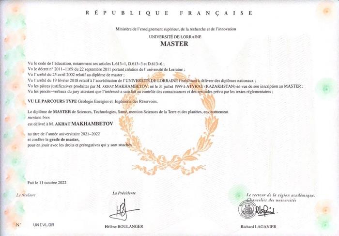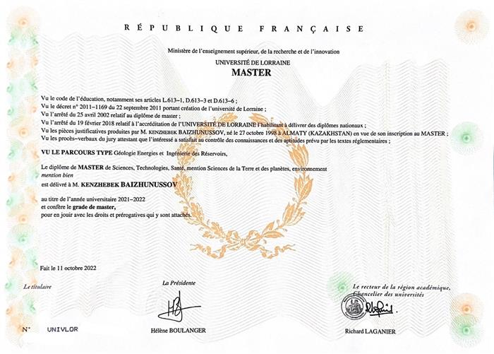 Diploma of awarding a master's degree to Makhambetov A.Ye. by University of Lorraine, 2022 |
