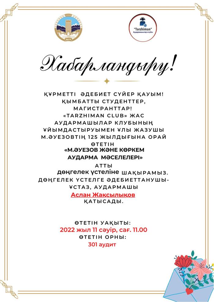 The club of young translators «Tarzhiman club» of the Department of Foreign Philology and Translation of Philological Faculty of al-Farabi KazNU will hold a round table on the topic “M. Auezov and the problems of literary translation” dedicated to M. Auezov’s 125th anniversary.
