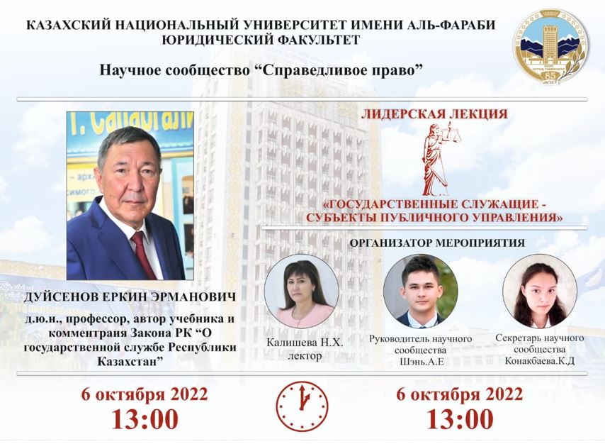 10/12/2022On October 12, at the Faculty of Law of Al-Farabi Kazakh National University, an educational event was held with 2nd-year students dedicated to the 95th anniversary of the birth of Academician of the National Academy of Sciences of the Republic of Kazakhstan, a prominent domestic political and public figure Sultan Sartaevich Sartayev.