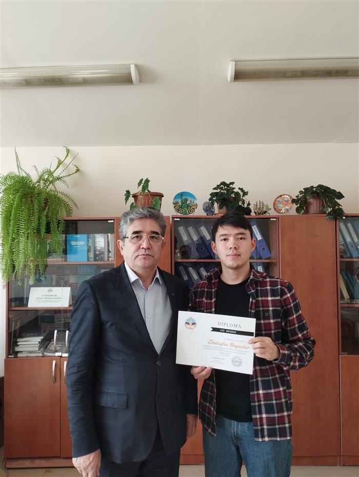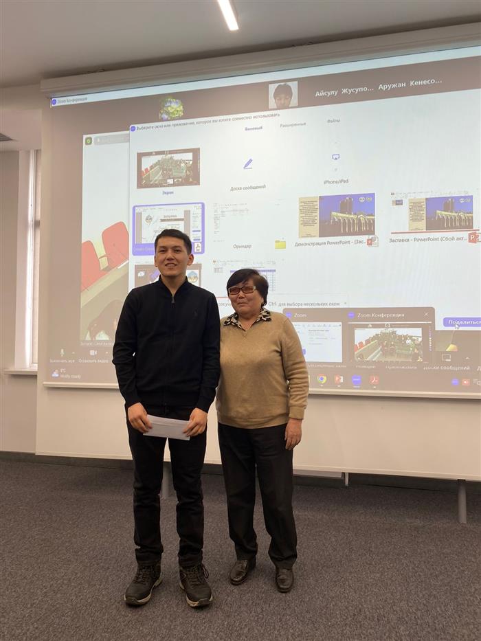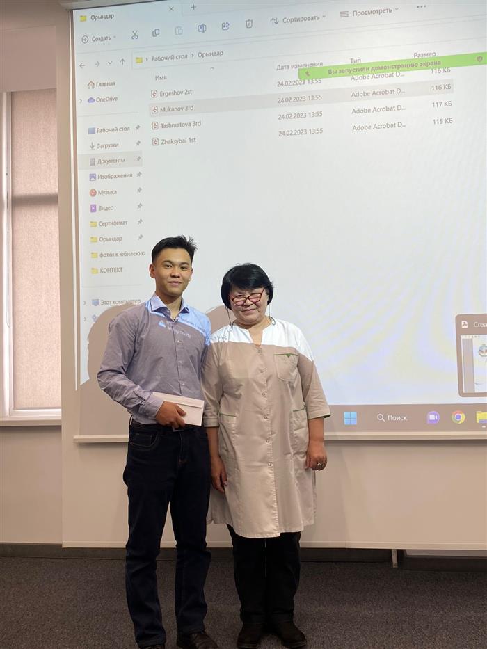 | Professor of the department Ospanova A.K. with the 2nd place winner Yergeshov M. | Associate Professor of the Department Tusupbekova A.S. with the 3rd place winner Mukanov A. |