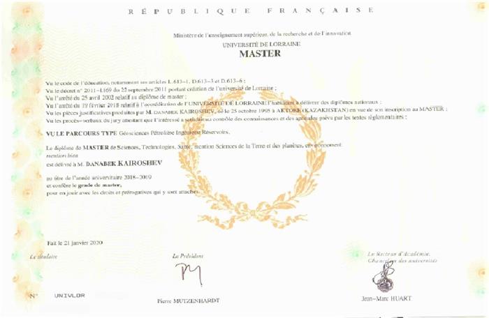 In the 2018-2019 academic year (II semester) under the Abai-Vern scholarship program, under the program of dual diploma education, master student of the specialty "Petrochemistry" of the faculty of chemistry and chemical technology Kairoshev Danabek Serikovich studied at the University of Lorraine (France) in the specialty of "Reservoir Engineering". He completed an internship at the Institut Élie Сartan de Lorraine (IECL) on the basis of a master's thesis. Kairoshev Danabek successfully completed his dual degree program and received a diploma from our university and the University of Lorraine.