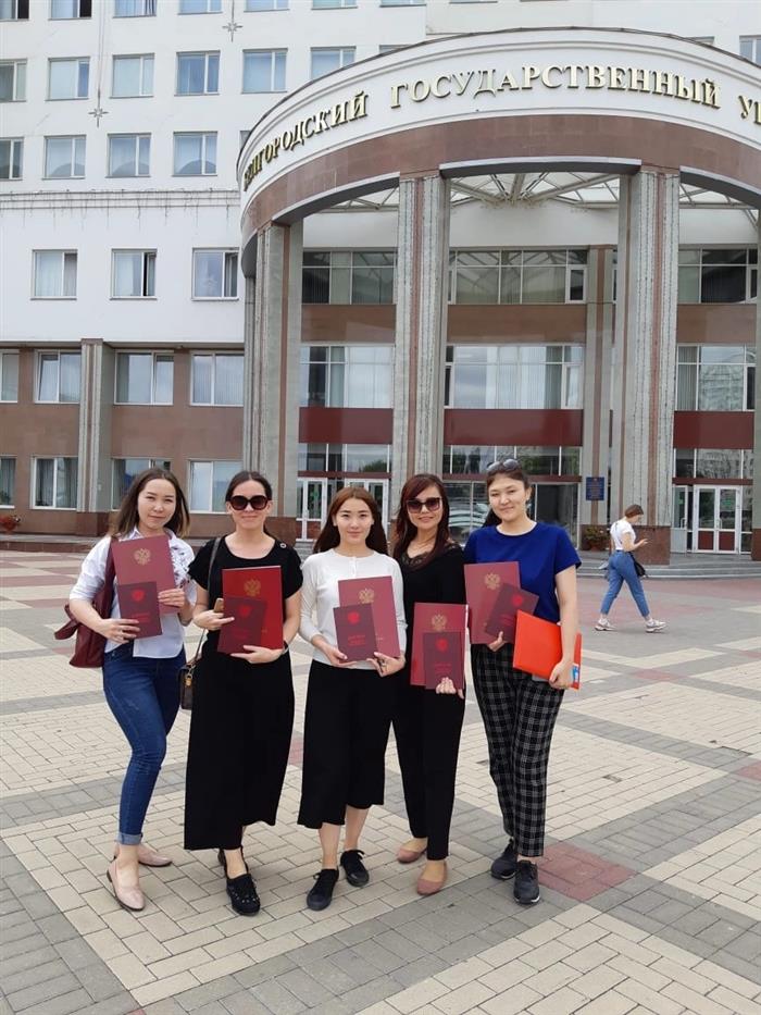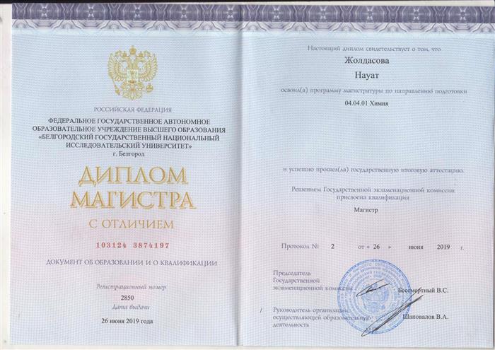 Diploma of awarding a master's degree to Zholdassova N. of Belgorod State University, 2019 |