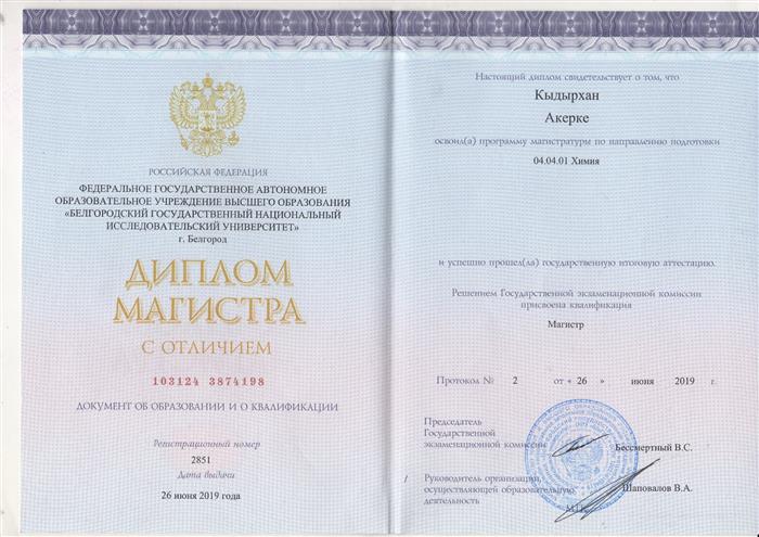 Diploma of awarding a master's degree to Kydyrkhan A. of Belgorod State University, 2019 |