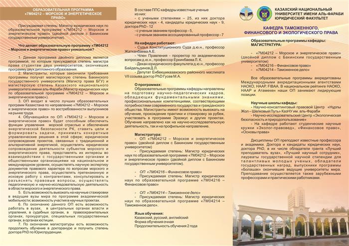 EDUCATIONAL PROGRAM"7M044212 – MARITIME AND ENERGY LAW"Degree awarded: Master of Law in the educational program 7M04212 – Maritime and Energy Law (double diploma with Baku State University).What makes the educational program "7M044212 – Maritime and Energy Law" unique?1. This dual degree program is a program that awards a master's degree in law to students of two universities who have completed a two-degree program.2. Undergraduates who have completed the requirements of the program will receive a master's degree from Baku State University (Master of Law of BSU) and a master's degree from Al-Farabi Kazakh National University (Master of Law in the educational program "7M044212 – Maritime and Energy Law").3. OP is among the best educational programs in Kazakhstan in the direction of "7M044212 – Maritime and energy law" in terms of the demand for graduates in the labor market.4. A student of the OP "7M044212 – Maritime and energy law" will be able to provide the functions of managing the maritime industry and ensuring the energy security of the Republic of Kazakhstan, set goals and form tasks, make specific management decisions in this area; legal support of projects related to traditional and alternative energy, to provide legal support for the activities of subjects of maritime and energy law, to represent their interests in cooperation with government agencies and public organizations at the national and international levels, to carry out scientific expertise of legal documents on issues of maritime and energy law, to carry out claim and claim work with contractors, to advise and clarify legal issues, to carry out pedagogical and research activities in the field of maritime and energy law.5. There is an opportunity to go on scientific internships in the leading universities of the world under the academic mobility program; the opportunity to participate in scientific projects.6. At the end of this OP, there is an opportunity to work in Universities, in central authorities and management