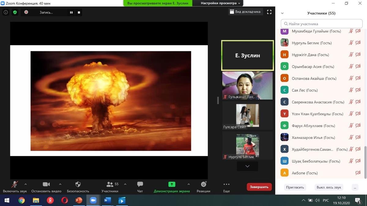 Activists of the youth organization, jointly with the International Anti-Nuclear Movement Nevada-Semey, celebrated the day of the last explosion on the Kazakhstani soil by organizing an online round table on «The decisive role of the IAD Nevada-Family and its leader Olzhas Suleimenov in stopping nuclear tests in Kazakhstan and closing the Semipalatinsk nuclear test site».
