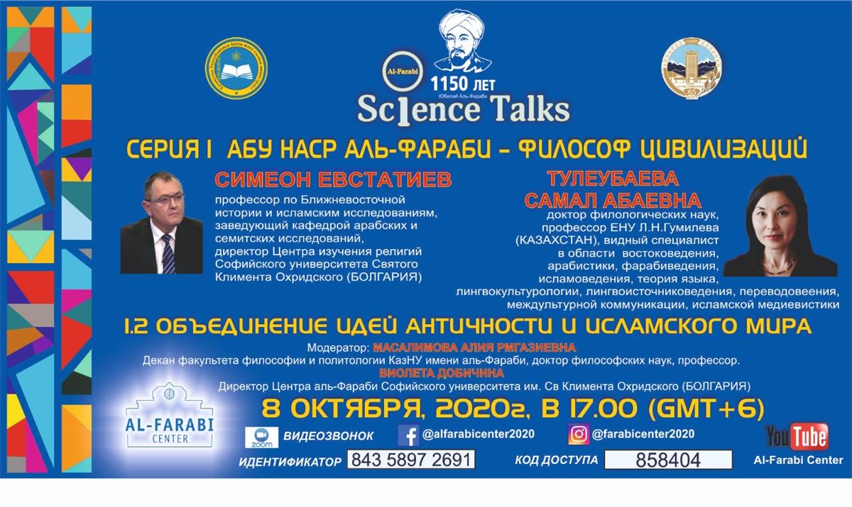 The Al-Farabi Center of Al-Farabi Kazakh National University with the support of the Ministry of Education and Science of the Republic of Kazakhstan continues a series of online Science Talks dedicated to the 1150th anniversary of the great thinker, comprehension of his creative heritage and its significance for contemporaries, as well as current issues of science.