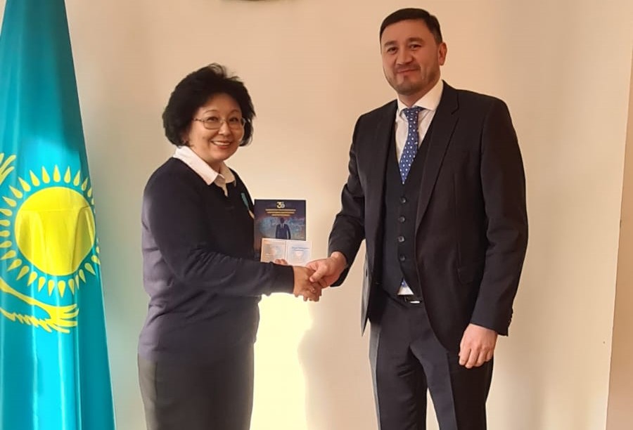 The Ministry of Foreign Affairs of the Republic of Kazakhstan awarded a scientist of KazNU Gulmira Amangeldievna Mashimbayeva the medal "30 years of Diplomatic Service". The award was presented to the scientist by the head of the Representative Office of the Ministry of Foreign Affairs of Kazakhstan in Almaty Bakhytzhan Bulegenov.