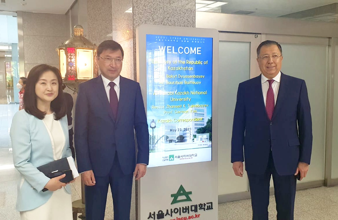 5/23/2023During the working visit of the Chairman of the Board – Rector of Al-Farabi Kazakh National University Zhanseit Tuimebayev to the Republic of Korea, a memorandum of understanding between Seoul Cyber University and Al-Farabi Kazakh National University was signed.
