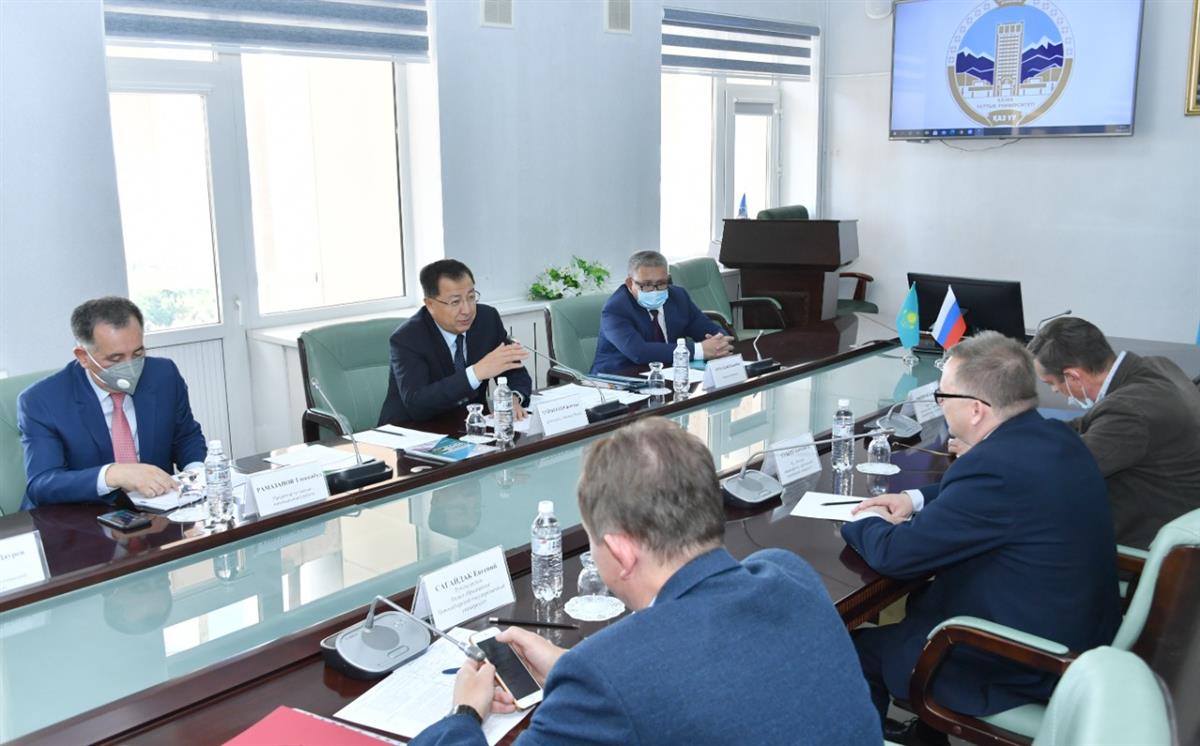 A meeting of the Chairman of the Board - Rector Zhanseit Tuimebayev with representatives of Russian universities - Izhevsk State Technical University (ISTU) and Novosibirsk State University (NSU) was held at Al-Farabi KazNU.